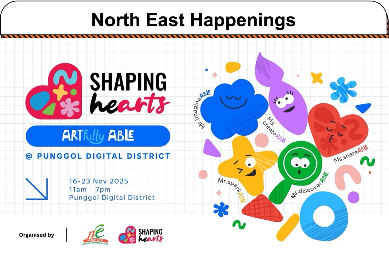 Dive into a week of creativity and excitement at Shaping Hearts — ARTfully Able, where art brings imagination to life and every ability is celebrated. From 16 to 23 November, Punggol Digital District transforms into a vibrant space with five exciting zones, each brought to life by a unique character. Join us and enjoy lively performances, hands-on workshops, and a range of fun activities for all ages. See you there! |